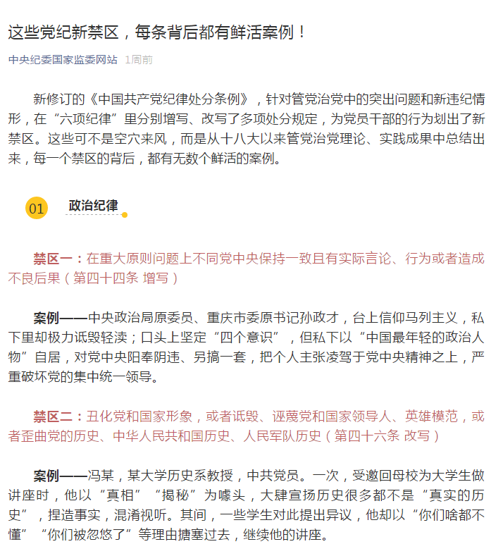為強(qiáng)化對(duì)《中國(guó)共產(chǎn)黨紀(jì)律處分條例》的學(xué)習(xí),學(xué)先一步,學(xué)深一層,學(xué)用結(jié)合,集團(tuán)紀(jì)委引用中央紀(jì)委國(guó)家監(jiān)委網(wǎng)站的內(nèi)容,帶領(lǐng)大家從“典型案例”中深刻領(lǐng)會(huì)《條例》修訂的重大意義,積極用《條例》武裝頭腦、筑牢防線(xiàn),進(jìn)一步增強(qiáng)紀(jì)律意識(shí)、規(guī)矩意識(shí)。下面,就讓我們通過(guò)案例看一看這些不能觸碰的禁區(qū)!